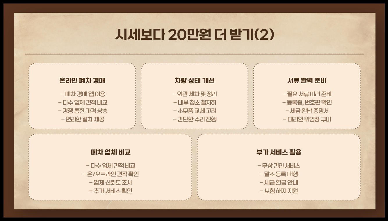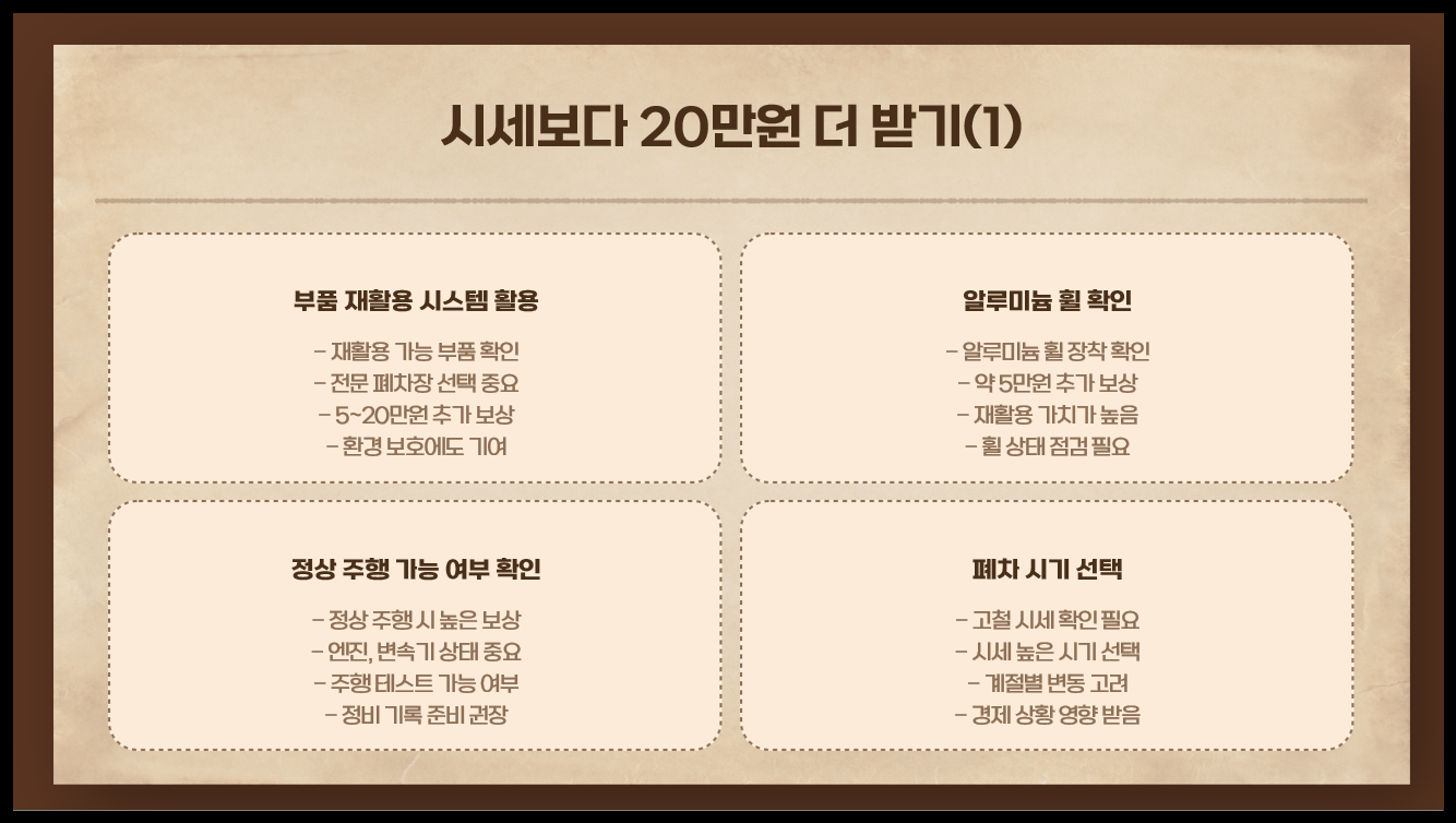 폐차 시기 선택: 고철 시세가 높은 시기를 선택하여 폐차하면 더 높은 보상을 받을 수 있습니다.