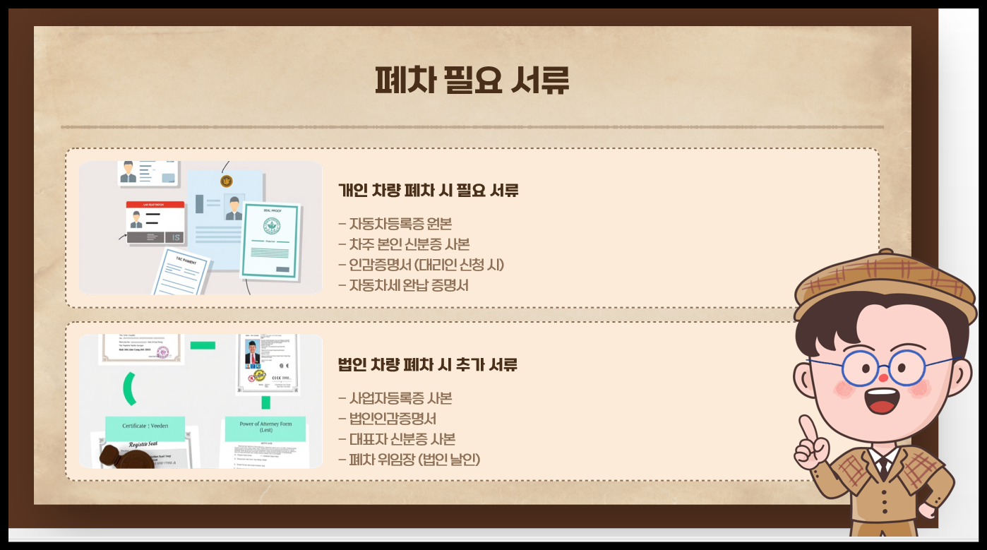 개인 차량 폐차 시 필요한 서류는 다음과 같습니다: